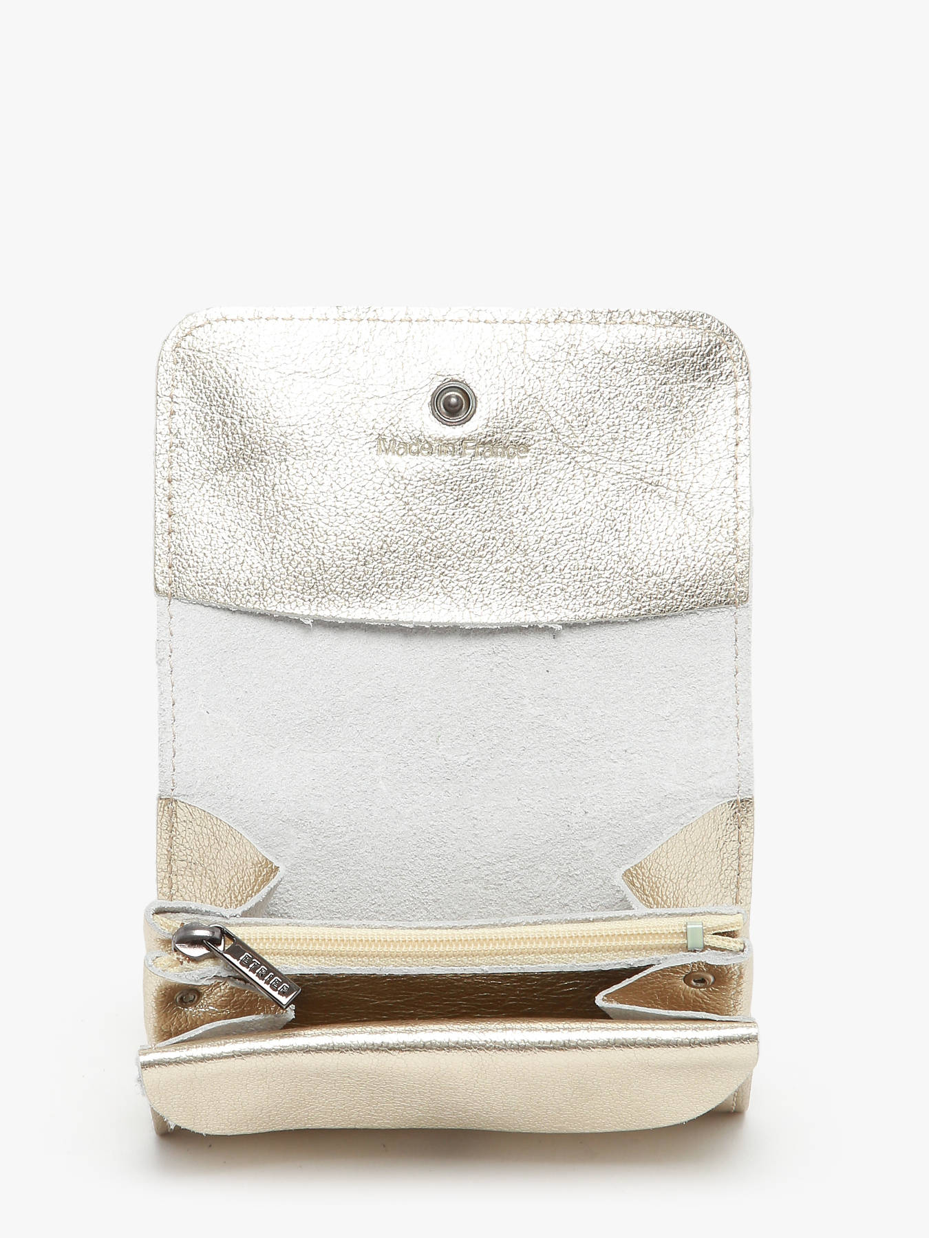 Fabriqué en France, on craque pour ce porte monnaie issu de la collection Etincelle Irisé qui se glissera facilement dans tous vos sacs à main. À l'intérieur de ce porte monnaie Etrier se trouve une poche zippée pour ranger votre argent en toute sécurité ainsi que deux poches simples pour vos reçus de caisse ou vos cartes bancaires. Il se ferme à l'aide d'une pression.